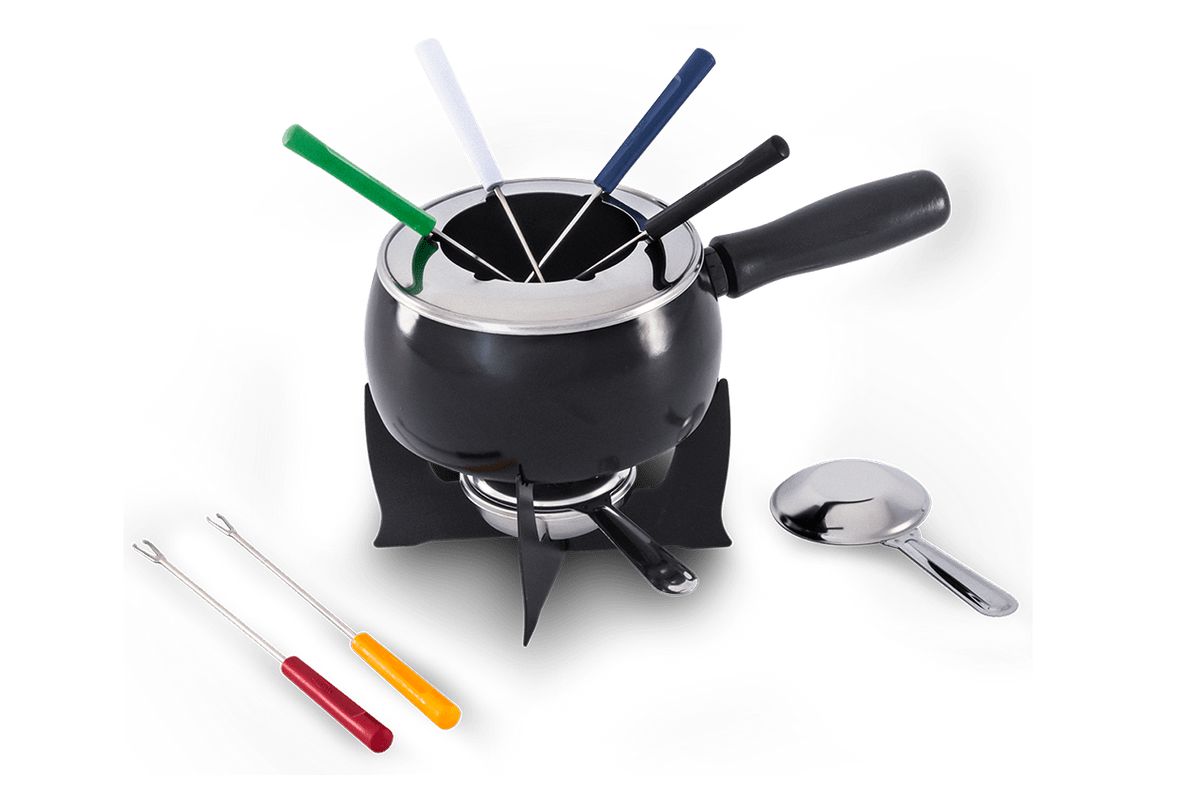 | Composição | 01 Caçarola Ø 16 cm - Esmaltada - Cabo Longo - 1,35 Litros 01 Separador de Garfos Aço Inox 06 Garfos - 22 cm - Cabos Coloridos 01 Suporte Epóxi 01 Fogareiro Aço Inox Menor com Abafador |