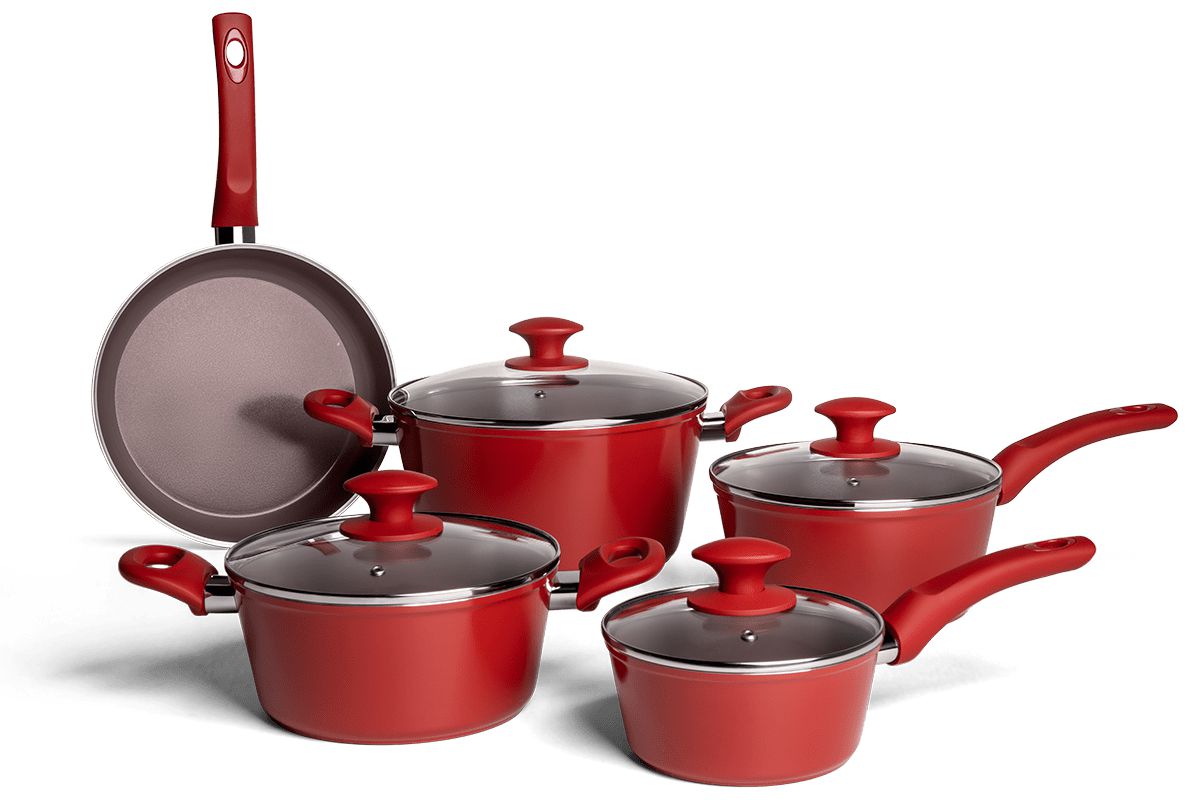 | Composição | Jogo de Panelas 5 Peças Com Fundo De Indução Optima - Carmin 01 Caçarola com Tampa Ø 24x13 cm - 4,6 L 01 Caçarola com Tampa Ø 20x9,5 cm - 2,1 L 01 Panela com Tampa Ø 20x9,5 cm - 2,1 L 01 Panela com Tampa Ø 16x7,5 cm - 1 L 01 Frigideira Ø 24x5 cm - 1,8 L |